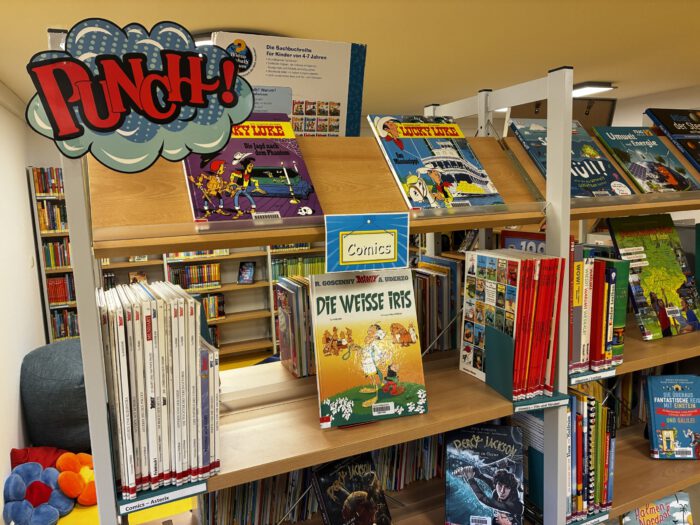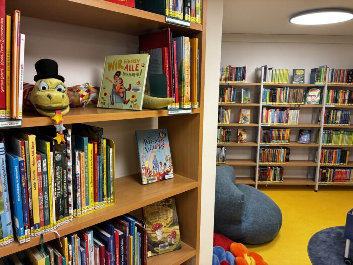 Hier haben wir eine große Auswahl an Kinder- und Jugendbüchern, u.a. Erstlesebücher, Serien, Sachbücher, Spiele, Hörbücher und DVD´s. Außerdem haben wir eine gemütliche Sitzecke zum Vorlesen, selber anschauen oder gleich mal ein Spiel spielen.